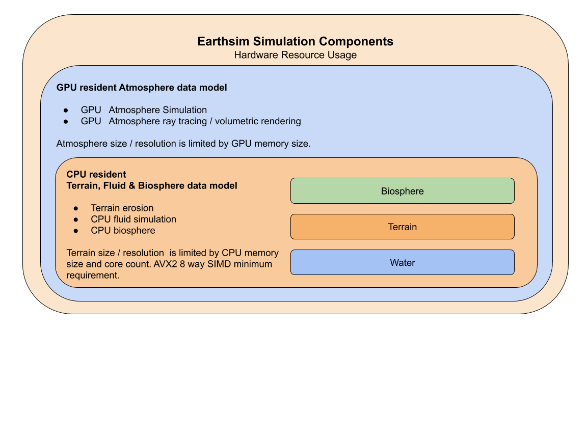 The landscape sand, earth and water simulations run on the multi core CPU to get the most out of the extra memory. This allows us to build and simulate a multi layer sediment model of the terrain (which is memory hungry but only requires fast access when land layers are modified which is less frequent) along with a real-time water simulation.