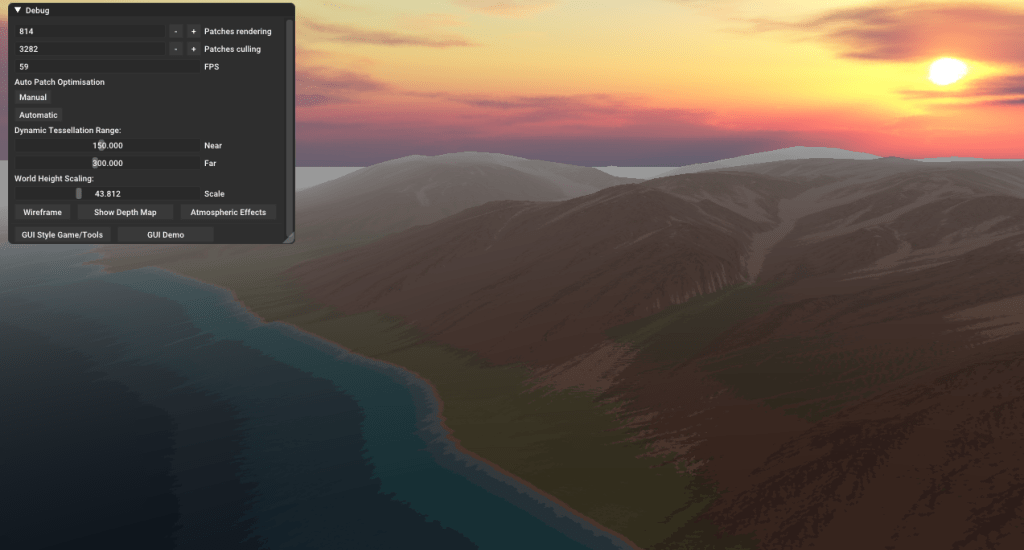This 1gig+ upload is then turned into a pyramid of LOD’s dynamically by the GPU to render the landscape. It is worth adding view frustum culling to the up-loader so we only load the LOD’s that are visible to the GPU, but that means calculating the LOD’s on the CPU. This should be relatively cost free to combine into the water and tallus engines.